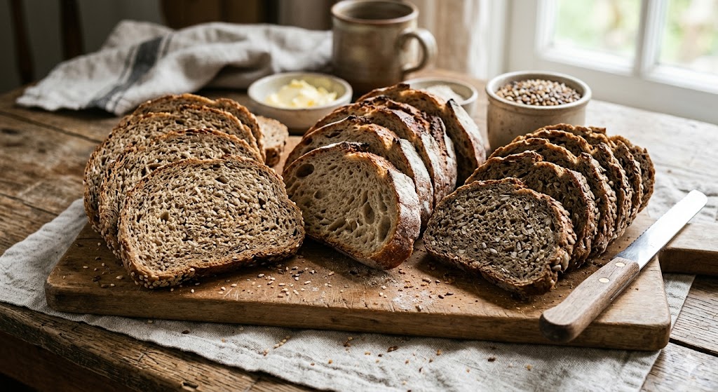 Để tối ưu cho hệ tiêu hóa và duy trì năng lượng ổn định, nên ưu tiên các loại bánh mì nguyên cám, bánh mì đen (rye bread) hoặc bánh mì men tự nhiên (sourdough). Những loại này giàu chất xơ, hỗ trợ hệ vi sinh đường ruột và giúp no lâu hơn.